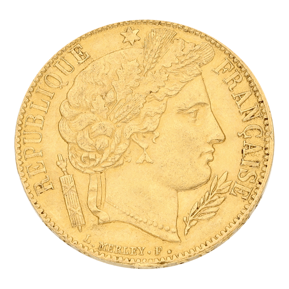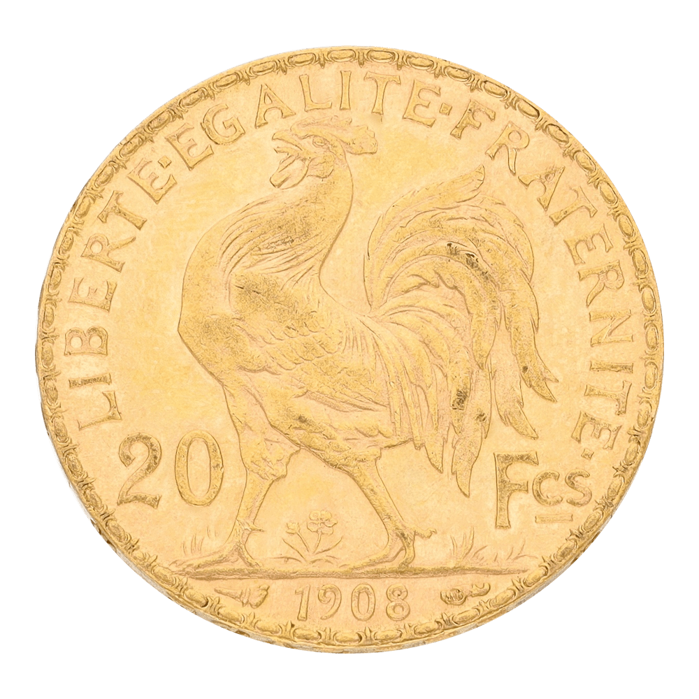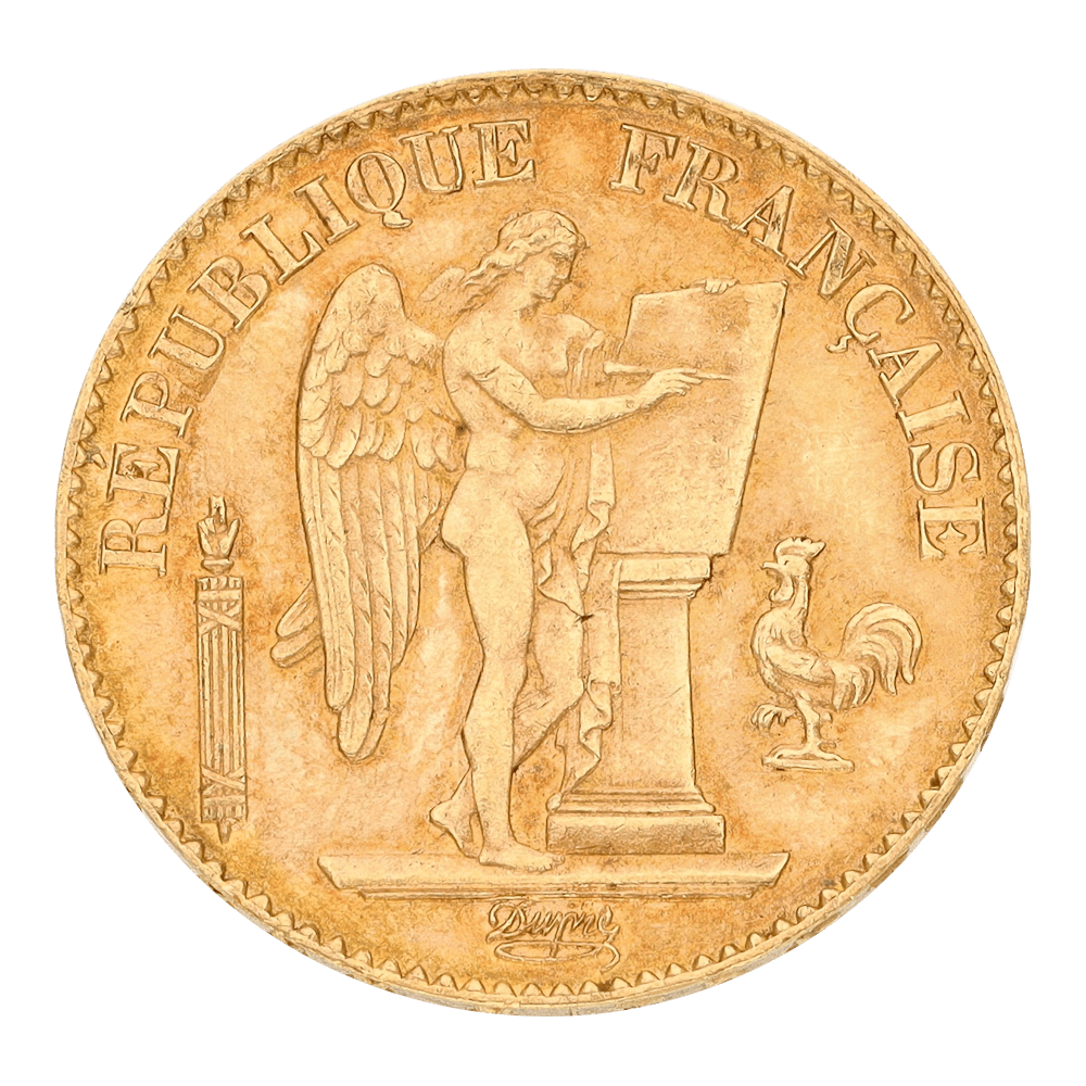 De 20 Franse francs zijn vanaf 1802 tot en met 1914 geslagen. Verschillende symbolen hebben de munt gesierd zoals Napoleon en de Gallische Haan. De Franse franc gaat zelfs verder terug. De Franse frank is namelijk tijdens de Franse revolutie opnieuw ingevoerd. Muntstukken uit deze tijd zijn echter zeer zeldzaam en komen weinig voor.
