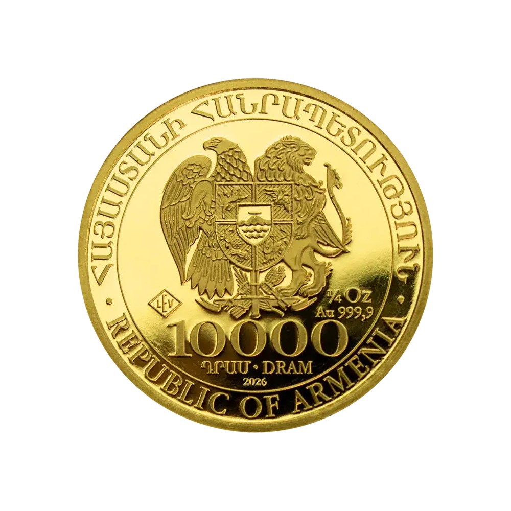 Op de voorzijde van de munt vind je het wapen van Armenië. Ook vind je hier het gewicht van de munt, de nominale waarde en het percentage aan goud wat erin verwerkt zit. Onderaan zie je het jaar waarin de munt geslagen is en de tekst 'REPUBLIC OF ARMENIA'.