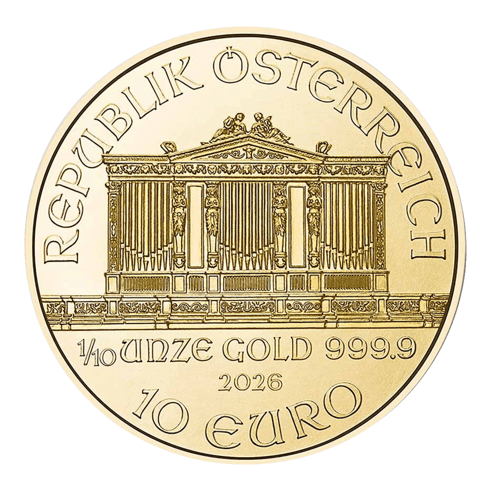 Op de keerzijde van de Philharmoniker pronkt het beroemde orgel uit de ‘Gouden Zaal’ van het concertgebouw in Wenen. Met daaromheen REPUBLIK ÖSTERREICH, 10 EURO en 1/10 UNZE GOLD 999,9, met daaronder het jaartal 2026. Het ontwerp van de munt is van Thomas Pesendorfer.