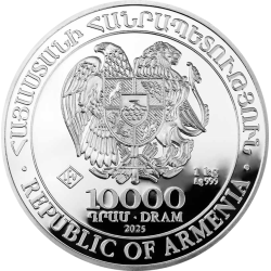 Op de voorzijde van de munt vind je het wapen van Armenië. Ook vind je hier het gewicht van de munt, de nominale waarde en het percentage aan zilver wat erin verwerkt zit. Onderaan zie je het jaar waarin de munt geslagen is en de tekst ‘REPUBLIC OF ARMENIA’.