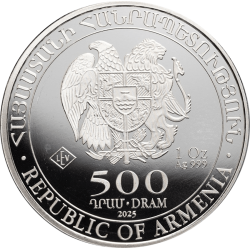 Op de voorzijde van de munt vind je het wapen van Armenië. Ook vind je hier het gewicht van de munt, de nominale waarde en het percentage aan zilver wat erin verwerkt zit. Onderaan zie je het jaar waarin de munt geslagen is en de tekst ‘REPUBLIC OF ARMENIA’.